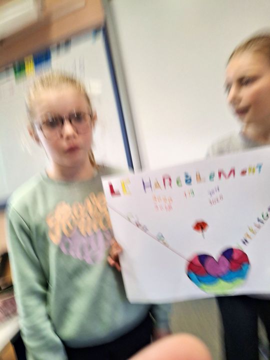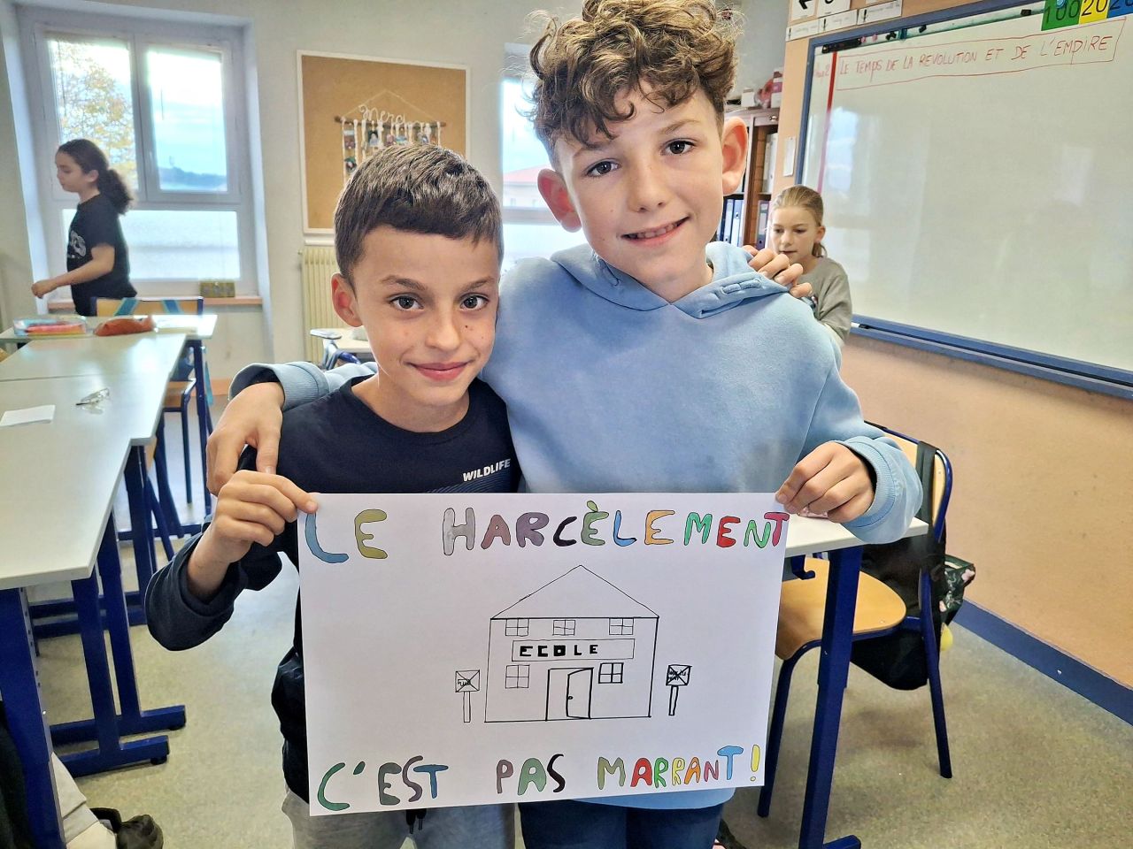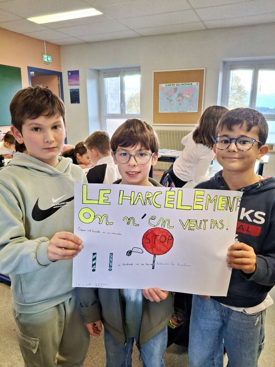 A l'occasion de la journée contre le harcèlement, les élèves de cycle 3 ont participé à des ateliers : enquêtes policières, écoute musicale, théâtre...afin de les sensibiliser aux dangers du harcèlement et de trouver des pistes pour lutter contre le harcèlement. De belles affiches créées à l'occasion viendront bientôt embellir nos couloirs et nous servir de rappel tout au long de l'année.